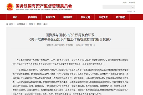 国资委与国家知识产权局联合印发����� �������Ƴ������������ �������Ƴ������������ �������Ƴ������������ �������Ƴ������� 《关于推进中央企业知识产权工����� �������Ƴ������������ �������Ƴ������������ �������Ƴ����������� �������Ƴ������作高质量发展的指导意见》 ����� �������Ƴ������������ �������Ƴ������������ �������Ƴ������������ �������Ƴ�������